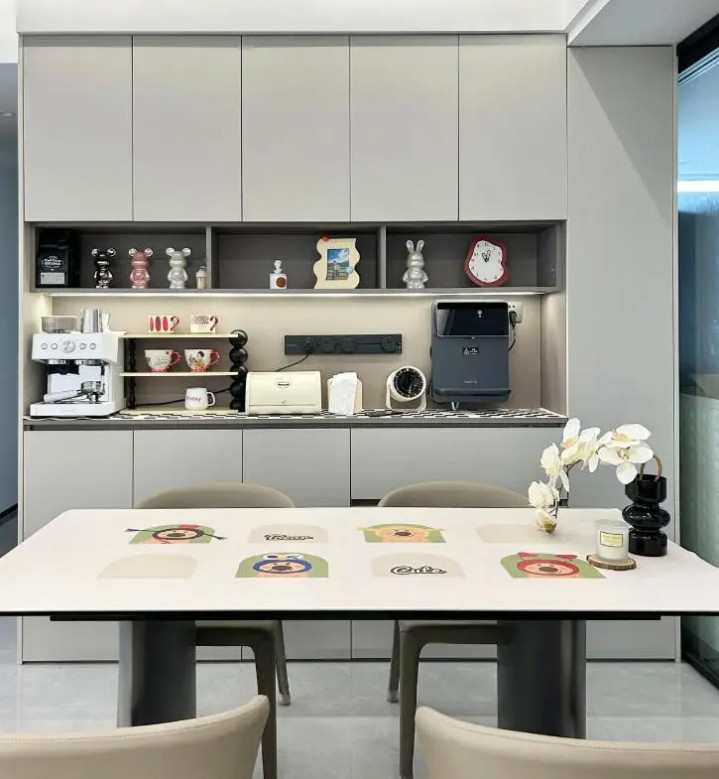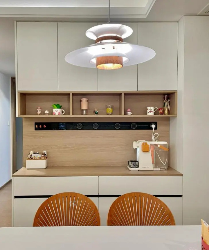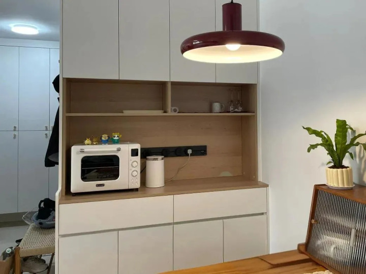餐边柜,家家户户必备,为方便小家电使用,中间开放格常配滑轨插座。