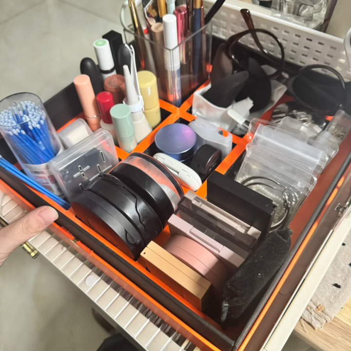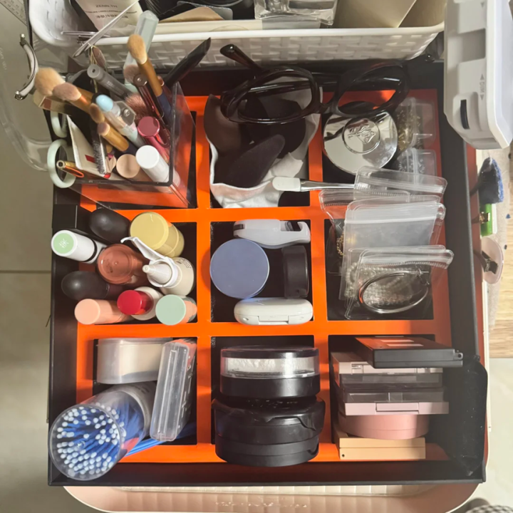 将彩妆产品分门别类放置在不同的小格子里,非常的整洁,拿取的时候也很方便。