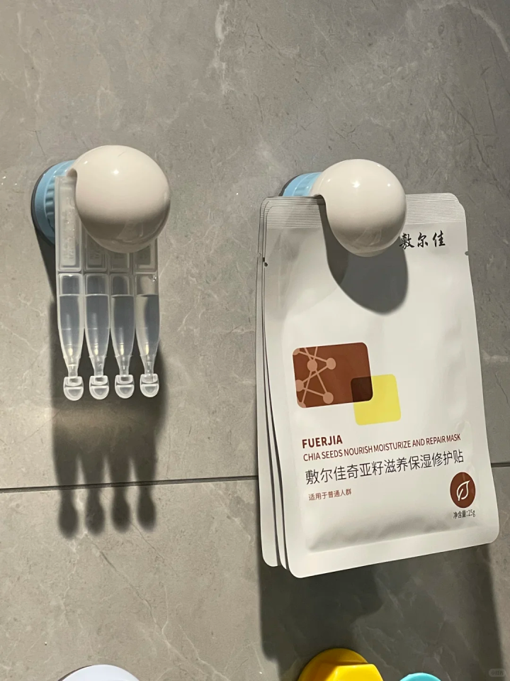 将牙膏收纳器粘贴在合适的位置,就可以把平时护肤时经常用到的次抛精华或者是面膜夹起来了,非常的方便,而且也很整洁。