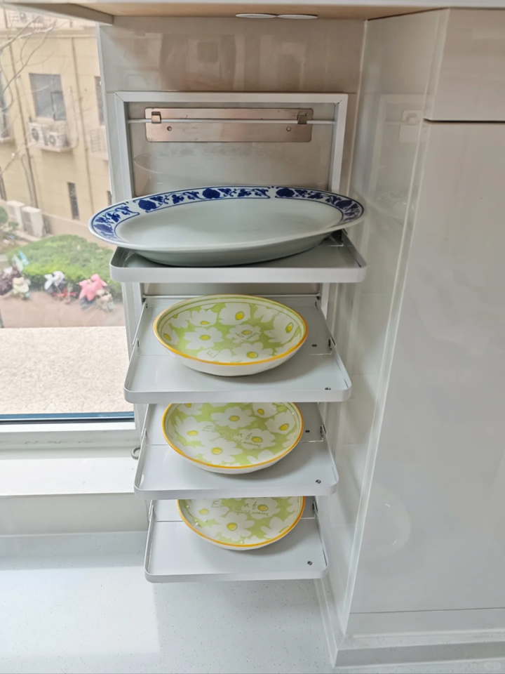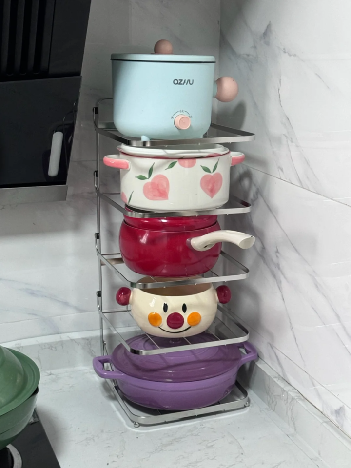 比如大家可以利用这种多层备菜架来收纳厨房的锅具或者是稍大一点的餐具,可以使橱柜更加的整洁。