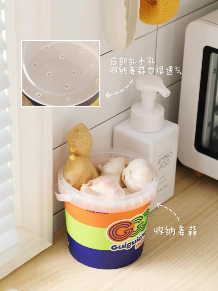 在奶茶杯的底部扎上一个小孔,就可以用来收纳生姜和大蒜,还方便透气。