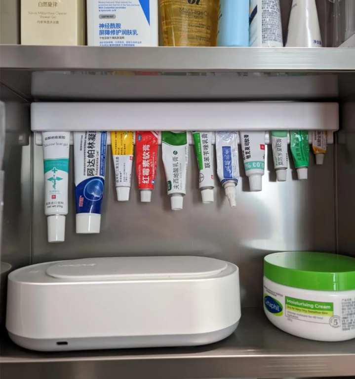 除此以外,大家还可以将牙膏收纳器粘贴在合适的位置,用来收纳一些常用的小药膏,或者是家里面常用的药物。