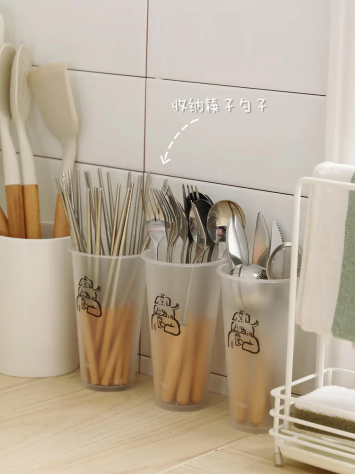 换一个思路,把奶茶杯放到厨房,就可以用来收纳平时所用到的勺子、筷子,或者一些简易的厨具。