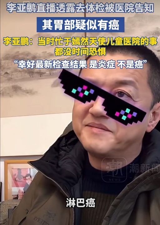 1月17日,李亚鹏直播时透露,上次体检后,他突然连续收到医院短信,后续301医院专家初步判断“大概率是淋巴癌”,并让他复查。但当时医院欠租风波正闹得沸沸扬扬,他忙着回应争议、对接捐款,连恐慌的时间都没有,面对医生还反过来安慰“没事”。